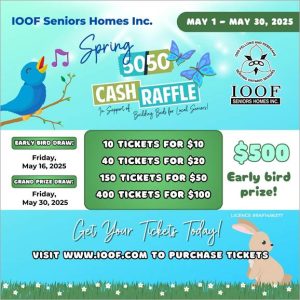 Tickets are available to purchase for the IOOF Seniors Homes Spring 50/50 raffle at www.IOOF.com <www.IOOF.com> . Proceeds from the raffle are donated to our redevelopment campaign to expand our long-term care facility. The grand prize draw will be held on Friday, May 30, 2025. Early bird purchasers will have an opportunity to win a $500 early bird prize drawn on Friday, May 16, 2025.